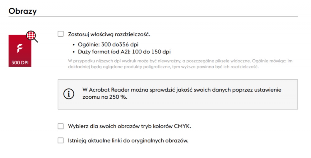 Dla wszystkich grafik pikselowych, tj. obrazów lub danych do druku utworzonych za pomocą programów do przetwarzania obrazów, takich jak Photoshop, podstawowe znaczenie ma wystarczająco wysoka rozdzielczość. Bezwzględna rozdzielczość układu graficznego oraz wszystkich zawartych w nim grafik i zdjęć powinna mieścić się w zakresie od 300 do 356 dpi, w zależności od produktu do druku.