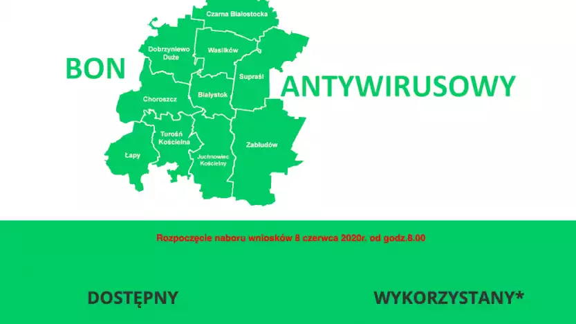 W województwie podlaskim z dniem 8 czerwca wystartował program „Bon Antywirusowy”.Program ma na celu dostosowanie prowadzonej działalności do funkcjonowania w czasie epidemii, reżimu sanitarnego oraz specyficznych uwarunkowań rynkowych, z tym związanych.O grant mogą ubiegać się mikroprzedsiębiorcy, mali przedsiębiorcy lub średni przedsiębiorcy,ale tylko i wyłącznie osoby które prowadzą działalność na terenie BOF czyli Białostockiego Obszaru Funkcjonalnego, a nie przedsiębiorcy z całego woj. podlaskiego.Wartość grantu na jaką mogą liczyć przedsiębiorcy z w/w obszaru na wsparcie jednego projektu to 100 000 zł.