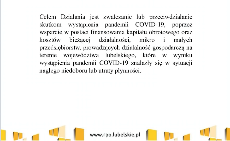 - wsparcie utrzymania działalności mikro i małych przedsiębiorstw dotkniętych skutkami epidemii COVID-19 w sytuacji nagłego niedoboru lub braku płynności finansowej.